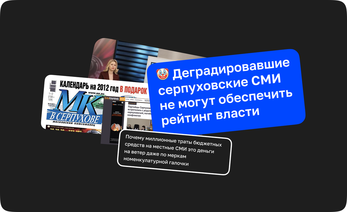 Из города с некогда мощнейшей медиа-средой, Серпухов за последние годы превратили в подобие Подольска, где из СМИ, испокон веков, были лишь телеканал «Кварц» да газета «Подольский рабочий».