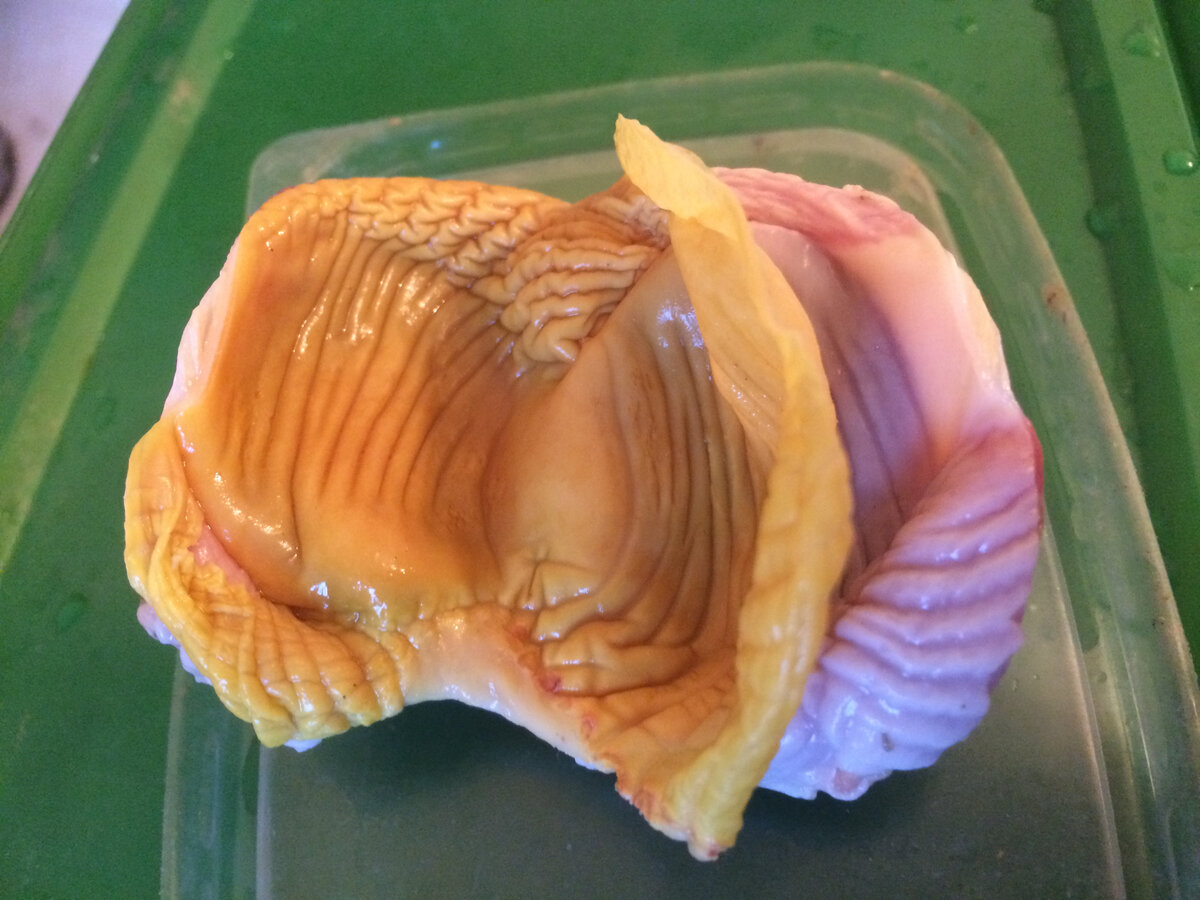 Имею категоричное мнение, что при приготовлении сыра обязательно используется сычужный фермент и закваска. Закваска необходима сыру, чтобы придать вкус, а фермент отвечает за сырную форму. Можно, конечно сделать и без этих элементов, в интернете масса рецептов но будет ли это сыр? или получится плотный спрессованный подсоленный творог? Напишу сразу, что раз уж я заменяю сырный фермент на молотую кутикулу от желудочков птицы, то и специальной сырной закваске можно найти замену. Например, вместо закваски можно взять йогурт, сметану или кефир - на 10 литров молока 200 грамм. Но о приготовлении сыра я напишу позже. А сейчас рассмотрю вариант, когда нет под рукой сычужного фермента. Можно использовать внутреннюю оболочку (кутикулу) желудочков курицы, либо любой другой птицы. Обычно сычужный фермент получается из одного из четырёх отделов желудка козлёнка (сетка, книжка, сычуг и рубец) Используем сычуг. Я нашла информацию на Фермер.ру об использовании в качестве сычужного фермента кутикулы