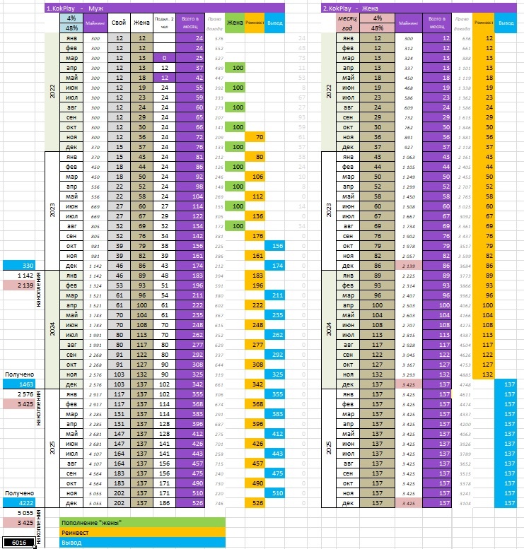 В предыдущей статье я показал Вам простые модели вложений и модель 300$+300$. В данной статье я покажу Вам модель KOK Play 300$+300$+2 Данная модель применяется к Вашим доходам, если вы подключили "жену" и еще 2 человек. Для простоты примера повторно возьмем семью (муж и жена), но это могут быть любые два человека у которых ОБЩИЙ семейный бюджет (или один человек, имеющий два телефонных номера!!!). Первое вложение средств (300$) производится "мужем", второе вложение средств (300$) - "женой" по коду "мужа". На 3-й и 5-й месяц от начала вложений муж присоединяет еще 2-х человек. При таком вложении "муж" получает вознаграждение от вложения собственных средств, от средств "жены" и от средств присоединенных 2-х человек. Принимаем во внимание то, что присоединенные люди такие же активные как вы, и тоже подключили жену и 2-х человек. Первый год ежемесячное реинвестирование осуществляется только во вложениях "жены", вознаграждения "мужа" копятся и выводятся из кошелька KOK Play для добавления