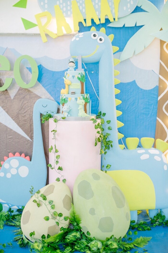 Первые дни рождения обычно оформляются в самой нежной гамме и с детскими атрибутами: изображениями солнышка, зверушек, персонажей детских книг. А мы нашли удивительный праздник, где тему динозавров видоизменили так, что она идеально подошла для годовасия! Кстати, декор для вечеринки ищите тут. А все благодаря тому, что всех динозавриков изобразили в приглушенных пастельных цветах, а их сделали не зубастыми и страшными, а веселыми! Посмотрите на эту чудесную фотозону, тут и улыбающееся солнышко, и светящиеся облачка, и славные динозаврики в розовых и голубых тонах! В зоне сладкого стола также поставили подарки для гостей, это были тематические сумочки, внутри которых спрятали сувениры. А на тортике изобразили не только динозавриков, но и самого именинника в пижаме кигуруми! Этот нежный голубой оттенок сразу говорит о том, что день рождения именно у малыша. Источник: karaspartyideas.com