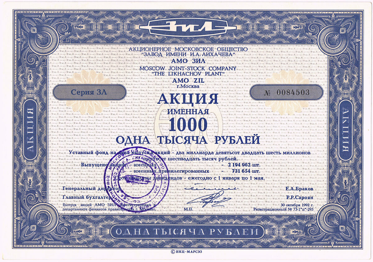 Один из крупнейших наших заводов, основанный в 1916 г. Для того чтобы вывести экономику предприятия из кризисного состояния и помочь коллективу выжить в сложившихся сложных условиях, в 1992 одни из первых в стране начали приватизацию. По расчетам каждый работник в среднем должен был получить 6 - 7 бесплатных акции по тысяче рублей каждая. Но, право на бесплатные акции были поставлены в зависимость от трудового вклада и стажа работы на предприятии. Поэтому, кадровый рабочий, 30 лет отдавший заводу и хорошо зарабатывавший, мог рассчитывать почти на полтора десятка тысячерублевых акций. Акции выпускались в двух вариантах - простая именная и именная привилегированная. Завод существует и в настоящее время, но в очень тяжелых условиях. В 2015 году большинство цехов завода демонтированы, а в сентябре 2016 года Завод имени Лихачева выпустил последний в своей истории грузовой автомобиль. Акция именная привилегированная на 1000 рублей #скрипофилия Источник: Банкноты мира
