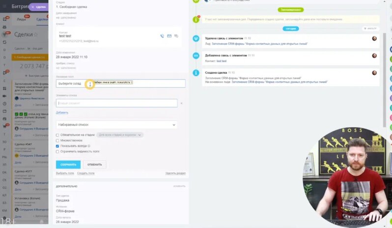 Частенько в компании есть специалист или даже руководители, которые немножко глубже знают Битрикс24.CRM чем все остальные сотрудники. Самое время поговорить о том, как сотрудники компании могут самостоятельно вносить изменения в настройки особенно если речь идет о микро автоматизации. Давайте на примере разберем как распределить одну и ту же задачу, на разных сотрудников отделов склада в зависимости от того, что заполнено в нашей сделке. Первое, что нужно, это создать новое поле тип список, не множественное, обязательное со стадией «менеджер назначен», в которое будет вноситься информация о разных типах услуг. В зависимости от значения этого поля робот будет ставить разным сотрудникам задачи. Пойдем путь от общего к частному. Выберем стадию, на которой робот будет ставить задачи сотрудникам. Чтобы робот понимал сотруднику какого склада нужно ставить задачу, необходимо описать условия. Таким образом в зависимости от типа услуги робот или человек будет выбирать определенный склад, дальше