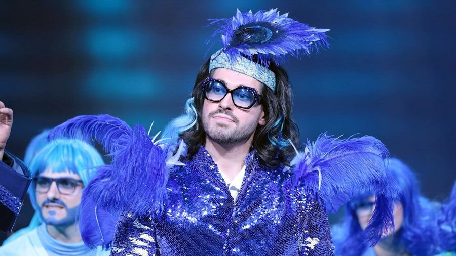 Вся сценография спектакля (Ростислав Протасов) решена в сине-голубых тонах — начиная с выхода к оркестру дирижера Филиппа Селиванова в голубом фраке и с голубой прядью в прическе и до голубой пирамидки-трона и голубых а-ля Мальвина париков хора-миманса. А трон принадлежит одетому в кружева, перья и стразы в стиле Филиппа Киркорова или Сергея Зверева эпатажного короля Какатуа. Сине-голубые костюмы (Ника Вылегжанинова) массовки удивительно напоминали униформу борт-проводников авиакомпании «Победа» — и это, судя по всему, намек на экзотическое музыкальное путешествие в дальнюю страну и его бюджетность — оперетта-фарс длится меньше часа и всего-то в ней по минимуму: и действующих лиц, и музыкантов в оркестре, и серьезных музыкальных задач.