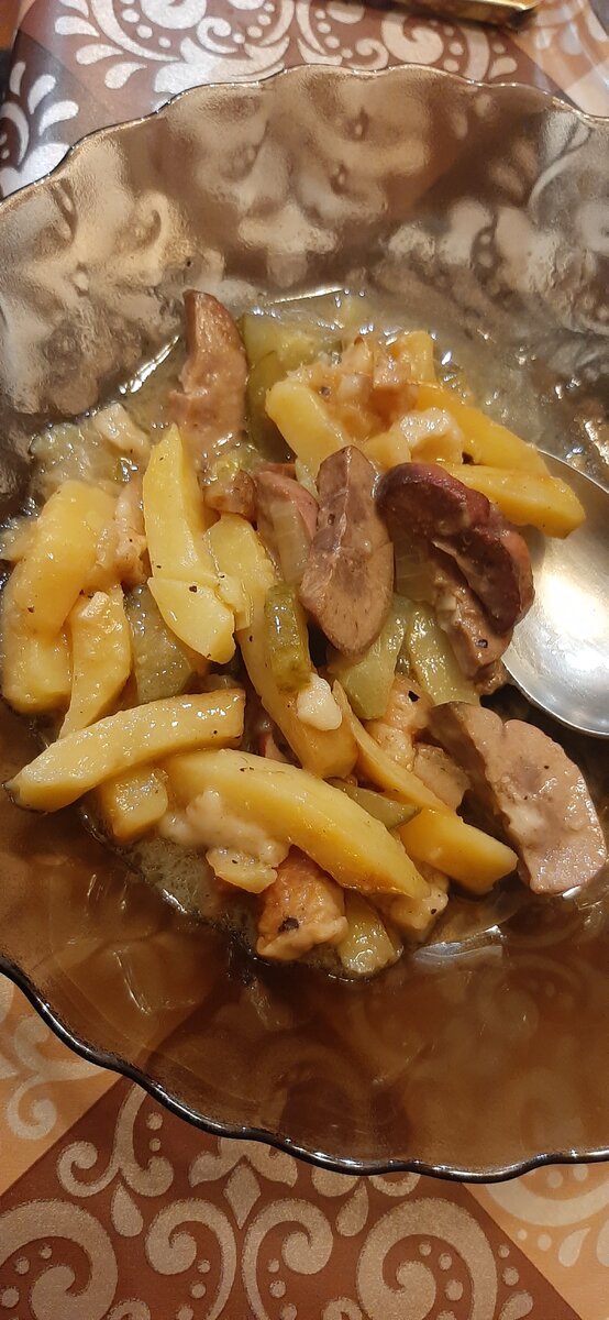 На 500 г говяжьих почек нам необходимо - 600 г картофеля; 1 головка репчатого лука; 3-4 соленых огурца; 1 ст. ложка муки; 2-3 ст. ложки масла. Итак, приступим. Почки зачищаем от жира, разрезаем вдоль пополам, кладем в кастрюлю, заливаем водой и доводим до кипения. После этого воду сливаем, почки промываем, заливаем свежей водой и варим до готовности примерно 1-1,5 ч. На бульоне, полученном при варке почек, готовим соус. Для этого столовую ложку муки с таким же количеством масла обжариваем до светло-коричневого цвета, разводим 1,5 стакана горячего бульона и провариваем на слабом огне 5-10 мин. Сваренные почки нарезаем небольшими ломтиками, прожариваем 2-3 мин. Лук также обжариваем. Отдельно обжариваем нарезанный дольками картофель (я жарила на сале), солим, перчим. Затем почки перекладываем в неглубокую кастрюлю, добавляем: - обжаренный лук, - нарезанный дольками поджаренный картофель, - нарезанные ломтиками огурцы, - 1-2 лаврового листа, - 5-8 горошин перца, - заливаем подготовл