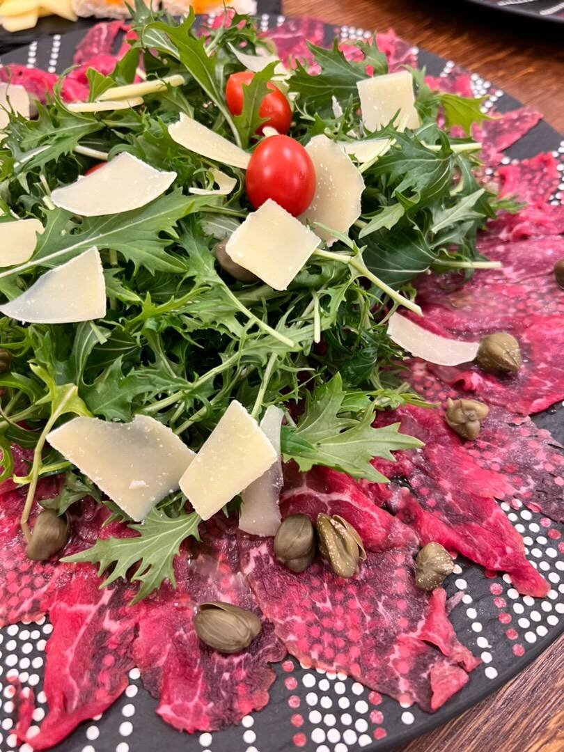 В нашей семье любят карпаччо) знаю, многие не едят сырое мясо. Но о вкусах не спорят 😁 Ингредиенты: Говяжья вырезка, Руккола, Каперсы, Пармезан, Соль и перец, Лимонный сок, Оливковое масло, Черри Способ приготовления: Говяжью вырезку надо покупать хорошего качества!!! Это очень важно! Заморозить. Нарезать очень тонко. Я режу на ломтерезке. На блюдо выкладываем мясо. Сбрызнуть лимонным соком, полить хорошим оливковым маслом, посолить и поперчить. Накрыть пленкой и убрать в холодильник к на мин 15. Промыть рукколу и обсушить. На мясо выкладываем рукколу, пармезан, Черри и каперсы. Полить ещё немного оливковым маслом. Это блюдо идеально сочетается с розовым шампанским!
