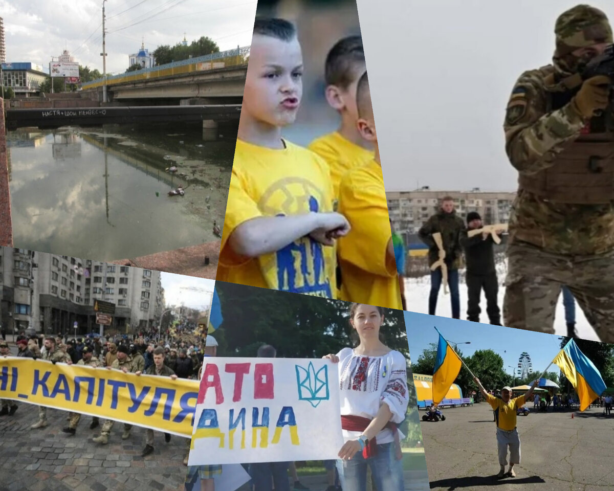 На Украине иные ржавые мосты и покосившиеся дома стоят, не падают, исключительно благодаря желто-синей патриотической раскраске. На видео с какого-то провинциального городка группа кричавших "слава Украине" товарищей топала по разбитой в хлам дороге, вдоль которой тянулся тротуар со старым, тоталитарным советским асфальтом и без бордюров. В сети можно найти многочисленные фото, где на фоне разрухи стоят гордо раскрашенные в цвета государственного флага автобусные остановки, урны, заборы и т.д. Этим украинцы как будто говорят всему миру, что не смотря на многочисленные проблемы, они очень патриотичны и любят свою Украину-нэньку. Патриотизм идёт с головы, с Киева, с первых лиц государства. Политики Украины, певцы и спортсмены, её президенты с депутаты с министрами регулярно одеваются в вышиванки, с чувством поют гимн своей страны, говорят пламенные речи исключительно на мове, отстаивают право на борщ котлеты по-киевмки и все как один готовы защищать родину от нашего с вами вторжени