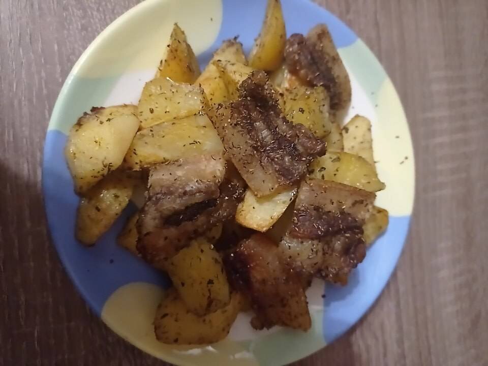 # календар Ингредиенты: Картоплі, Сала, Сіль по смаку, Приправа, ст ложок олії Способ приготовления: Чистимо картоплю.Потім її перемиваємо,і ріжемо дольками. Беремо картоплю і бумажним полотенцем обсушуємо її.Беремо іншу миску і добавляємо туди приправу сіль і олію і перемішуємо добавляєм картоплю і ще раз перемішуємо. Беремо сало ріжемо його і кладемо зверху на картоплю. Ставимо в духовку на 180° 40хв І насолоджуємось.Виходить дуже смачно 😊