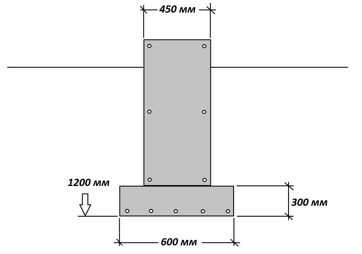 Проект своего дома мы доверили профессионалам, которые проработали в нем каждую мелочь и уже через месяц вернули нам готовый пакет, содержащий кроме конструктивных особенностей еще и планы инженерных сетей! Еще через месяц было получено и разрешение на строительство. Для нашего мансардного дома общей площадью 130 кв.м. проектом был предусмотрен ленточный фундамент, но не просто обычная лента в сечении представляющая прямоугольник, а с уширением основания в виде перевернутой буквы "Т". Фундамент должен был выглядеть вот так: Основная стенка фундамента, на которую будут опираться стены, составляет в ширину 450 мм, а вот опирание на грунт инженеры сделали увеличенным — 600 мм, это связано с особенностями несущей способности грунтов. Не секрет, что такие фундаменты выходят затратными, поскольку делаются исключительно в два этапа. Здесь нельзя просто вырыть траншею и залить бетоном, сначала требуется залить широкую "подушку", ждать пока она затвердеет и только потом сооружать оставшуюся час
