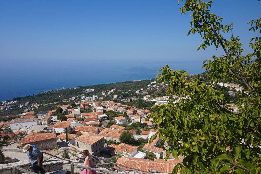 С греческим селом (я бы назвал его городком, пусть и небольшим) в горах Албании я познакомился во время экскурсии на перевал Логара. Единственная автодорога - серпантин, спускающаяся с перевала Логара к берегу Ионического моря неминуемо приведёт вас в село Дерми. Впрочем, это албанское название, местные греки упорно продолжают именовать его Дримадес (Drymades). В городке преобладает именно греческая община. Греку или албанцу принадлежит тот или иной дом легко определить по цвету ворот и забора - у албанцев они серые, а у греков бело-голубые. Под цвет греческого флага. А вот крыши все одинаково оранжевые. Целью нашего посещения этого села была церковь Святой Девы Марии. Saint Mary Church или Kisha e Shen Merise в переводе на албанский - старинная греческая православная церковь. Расположена она на едва ли не на самой высокой точке Дерми. Даже петляние по узким улочкам села вплотную к церкви нас не очень-то приблизило, и пешее восхождение к храму никто не отменял. И вот, запыхавшиеся