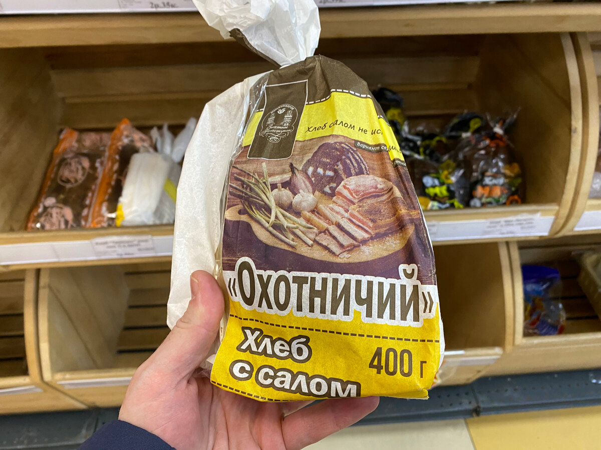 Всем привет! Что-то давно на нашем канале мы не писали об интересных белорусских продуктах. Может, вы уже успели подумать, что все интересные – закончились? Как бы не так. Белорусы умеют удивлять. И чтобы это понять, надо иногда заглядывать в местные магазины. Охотничий На днях гуляли по Минску. Уже возвращаясь домой, зашли в магазин "Хлебный уголовок", что на Сторожовской улице. Кстати, именно там мы как-то покупали вкуснейшие советские пирожные. То есть пирожные, конечно, белорусские, но сделаны точь-в-точь под советские. Они еще продаются в таких олдскульных картонных упаковках... Рекомендую, одним словом. Мне нужен был хлеб. Приглянулась необычная серо-желтая упаковка. Хлеб назывался "Охотничий", и белым по желтому на нем было написано "С салом". Я сначала не поверила. Даже переспросила у продавщицы, что имеется в виду? Оказалось, то и имеется. Сало. В хлебе. Чего тут непонятного? Где же сало? Вы когда-нибудь ели хлеб с салом? Странный вопрос, если задуматься. Но так, чтобы сало