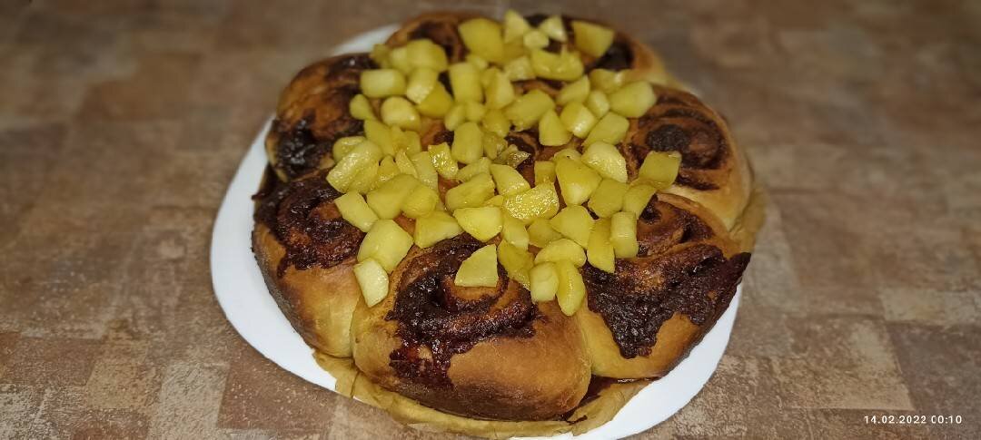 Ингредиенты: ДЛЯ ТЕСТА: , теплого молока, дрожжей, сахара, яйца, сливочного масла, муки, НАЧИНКА: , сливочное масло, сахара, корицы, шоколада, КАРАМЕЛИЗИРОВАННЫЕ ЯБЛОКИ:, яблоко кислых сортов, сливочного масла, сахара (коричневого сахара)