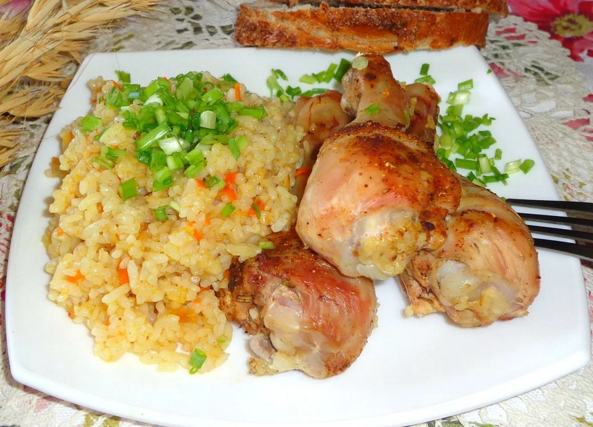 Ингредиенты: Процесс приготовления: 1. Курочку вымойте и обсушите при помощи бумажного полотенца. Затем со всех сторон натрите птицу специями, не пропуская ни одного участка. Птицу поместите в холодильник на пару часиков, чтобы она пропиталась специями и мясо получилось еще более мягким и ароматным. 2. Возьмите пропаренный длиннозерный рис и тщательно промойте его, пока вода не станет прозрачной. Затем выложите его ровным слоем на дно глубокой формы для духовки. Можете присыпать его солью и душистыми травами – розмарином, базиликом и т.д. 3. Достаньте курочку из холодильника и поместите ее прямо на рис в форму. Чеснок очистите от шелухи, сполосните и положите к курице с рисом на свободные места. Затем влейте в форму питьевую воду так, чтобы она покрывала рис примерно на сантиметр. 4. Затем затяните фольгой форму с блюдом и разогрейте до 180 градусов духовой шкаф. В горячую духовку поместите курицу и запекайте сорок минут. 5. После того как пройдет сорок минут, снимите с формы фольгу