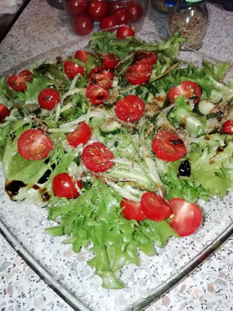 Вдохновилась я романтической обстановкой на день влюбленных. И захотелось чего то лёгкого, воздушного. А помидорки черри как маленькие сердца любви. #игры #рецепт #повар #шефповар Ингредиенты: Салат фриллис, Средний огурец, Помидоры черри, л Бальзамический соус, л Масло виноградный косточки, по вкусу Итальянские травы, по вкусу Чёрный свежемолотый перец, Сок лимона с сахаром. У меня уже заготовленный стоит Способ приготовления: Овощи помыть и просушить. Порвать салат. И выложить на тарелку. Огурец потереть на тёрке для морковчи. Это важно!!! Он получается вкуснее. Выложить на салат. Сверху положить помидорки. И залить все балзамиком, маслом и соком лимона. Приправить. И подавать к столу.
