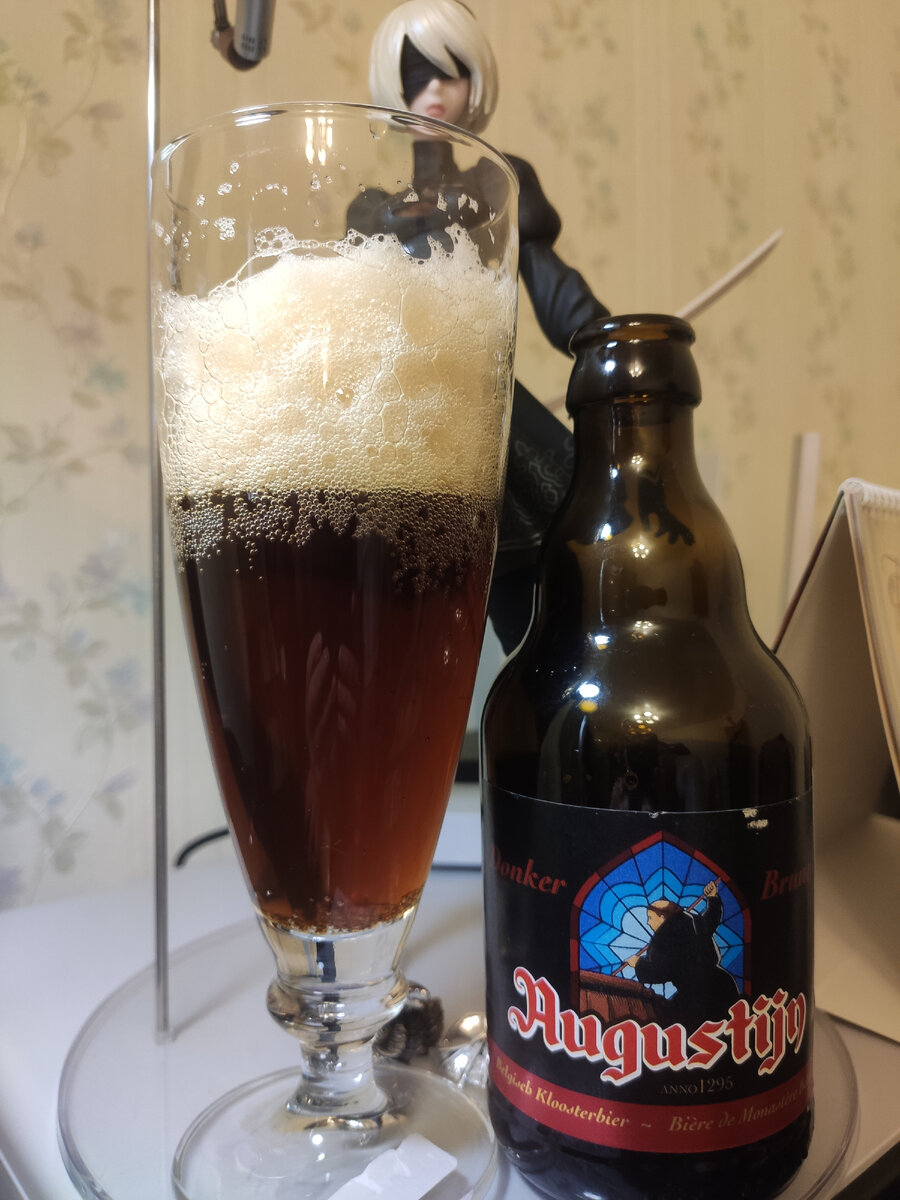 Пробуя аббатское пиво, думаю, в самый раз задуматься - а не отринуть ли все мирское с его "суетой сует" и свалить в глушь, сидеть в каком-нибудь аббатстве и попивать пенное.. Мечты-мечты, где ваша сладость? Эх.. Ну да ладно, хорошо хоть среди серых будней есть возможность окунуться в мир медитации над бокальчиком Augustijn Donker (Brune) Страна происхождения Бельгия Стиль аббатский(бельгийский) дюббель Цвет темное фильтрованное непастеризованное Алкоголь 8 % Горечь - IBU Цена 190 - 220р. Цвет насыщенный янтарно-коричневый, с довольно плотной белой шапкой долго оседающей пены. В аромате жженая карамелька, корочка заварного черного хлеба и чуть шоколадно-кофейности. На первых глотках плотности вроде как и не ощущаешь сильно, дальше накатывают нотки портвешка или даже рома, чуть спиртуозно, но согревающе, что зимним вечером особо приятственно. Во вкусе ириско-карамельные солодовые тона, чуть дубовой бочки, чуть кофе и заварного хлеба. В целом, неплохо, но чутка будто баланса этому пиво