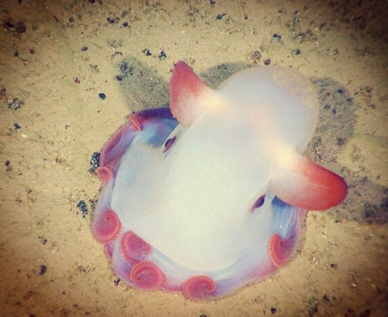 Это осьминог Думбо! Это чудо живет на больших глубинах (от ста до пяти тысяч метров) и занимается преимущественно поиском ракообразных и червеобразных на морском дне. Свое название, напоминающее о слоненке с большими ушами, осьминог получил благодаря двум плавникам необычной формы.