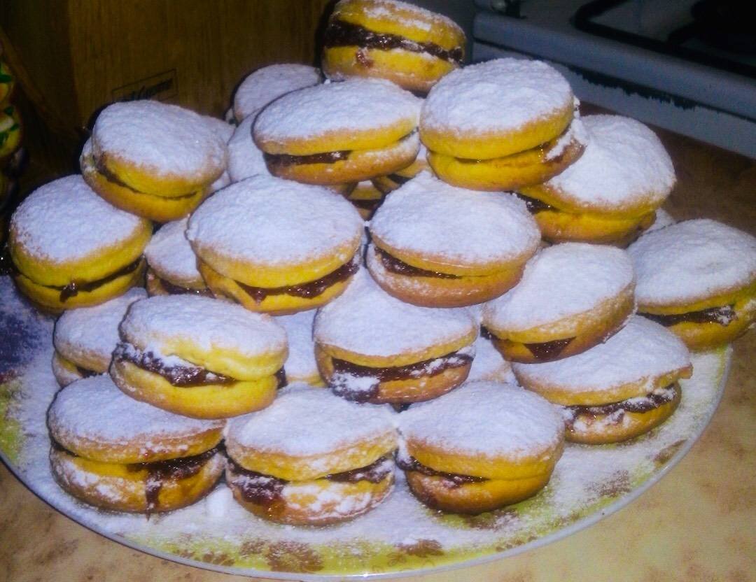 Мягкое и очень вкусное печенье. Ингредиенты: муки, яйца, сливочного масла, молока, сахара, апельсин (или апельсиновые капли), соды или разрыхлитель Способ приготовления: Отделяем желтки от белков В желтки всыпаем сахар и орошо взбиваем до бела. Вливаем тёплое сливочное масло и натираем апельсиновую цедру, добавляем разрыхлитель. Вливаем молоко и хорошо взбиваем. Белки хорошо взбиваем в пышную пену. Перекладываем белки в желтки и перемешиваем, при этом постепенно всыпаем муку. Перемешиваем осторожно в одном направлении очень тщательно. На застеленный пергаментом противень, выкладываем кольца для пирожных, если у вас нет, то можно просто ложкой выкладывать тесто оставляя расстояние между печеньками. Тесто нужно ставить немного, чтобы печенья не были слишком высокими. Выпекаем 25 минут при 170 градусов. Готовые бисквиты после остывания вынимаем из колец и соединяем их по два смазывая любым джемом. Посыпаем пудрой.
