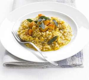 ШАГ 1Нагрейте духовку до 220С/200С вентилятор/газ 7. Бросьте тыкву в 1 столовую ложку масла вместе с нарезанным шалфеем. Выложите в неглубокую форму для запекания и жарьте в течение 30 минут до коричневого цвета и мягкости.