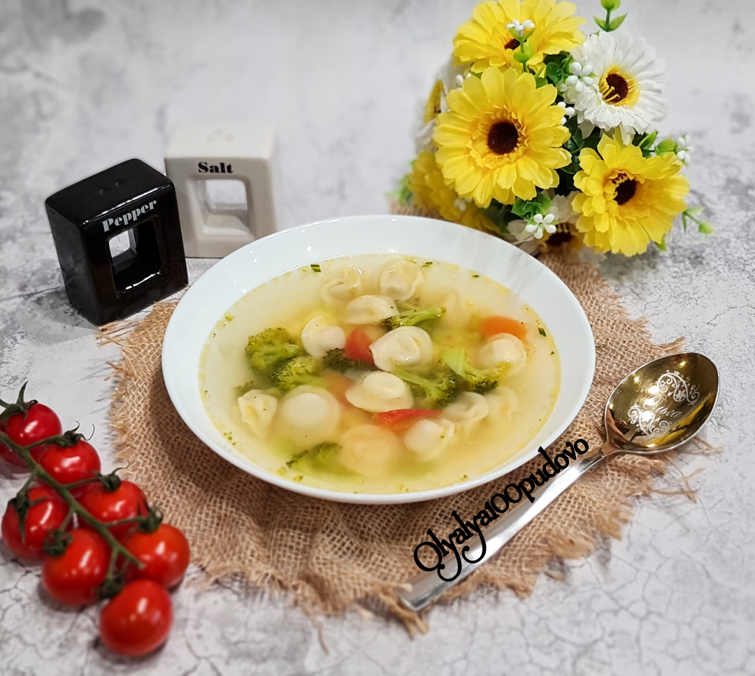 Прекрасный вариант быстрого, лёгкого и вкусного супа. При желании в него можно добавить морковь или другие овощи, а также зелень. Для приготовления супа отлично подходят мини-пельмени, но если их нет, то можно использовать и обычные. Вместо воды и бульонного кубика лучше использовать натуральный мясной бульон. #игры Ингредиенты: воды или мясного бульона, средние картошки, мини-пельменей, брокколи, луковица, помидоров черри, куриный бульонный кубик, соль, чёрный перец, зелень Способ приготовления: Наливаем воду в кастрюлю и ставим на плиту. А пока вода закипает, чистим и режем на кубики картофель. Вода закипела, отправляем в неё промытый картофель. Варим его до мягкости. Брокколи разбираем на маленькие соцветия, лук режем мелким кубиком, помидоры черри режем на 4 дольки или половинки. Когда картофель сварился отправляем в кастрюлю бульонный кубик, пельмени, лук, брокколи и помидоры. Солим, перчим по вкусу. Варим всё ещё минут 5 и снимаем с плиты. При подаче можно посыпать зеленью, у мен