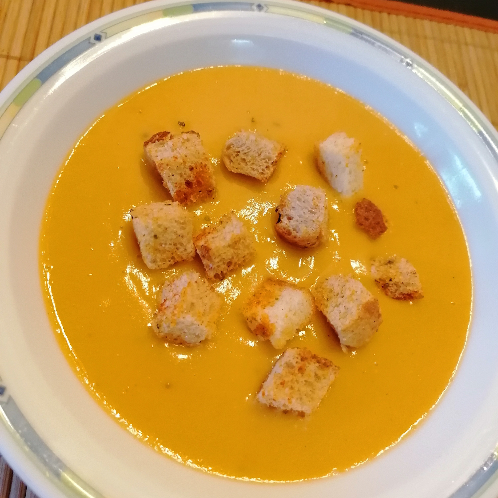 #игры За идею и вдохновение хочу поблагодарить Бориса Курилович. Суп идеальный, рекомендую... Делюсь своим рецептом вегетарианского варианта этого супа. Ингредиенты: чечевицы красной, средняя луковица, средняя морковь, средняя картофелина, тыквы, овощного бульона, топлёного масла, Соль, перец, мускатный орех, тимьян, цветочный карри Способ приготовления: Примерно 500 мл воды довести до кипения и добавить бульон. В кипящий бульон добавить промытую чечевицу и мелко порезанный картофель. Варим до полуготовности. Лук, морковь и тыкву почистить и мелко порезать. На сковороде на топлёном масле припустить лук и морковь, затем добавить тыкву и припускать дальше до мягкости моркови и тыквы. Затем перекладываем к картофелю и чечевице и варим все вместе ещё пару минут, по надобности можно добавить немного кипятка, густоту супа регулируйте сами. Как все овощи стали мягкими, к этому моменту чечевица разварилась практически. Суп перебиваем погружным блендером, добавляем специи. Убираем с огня, закры
