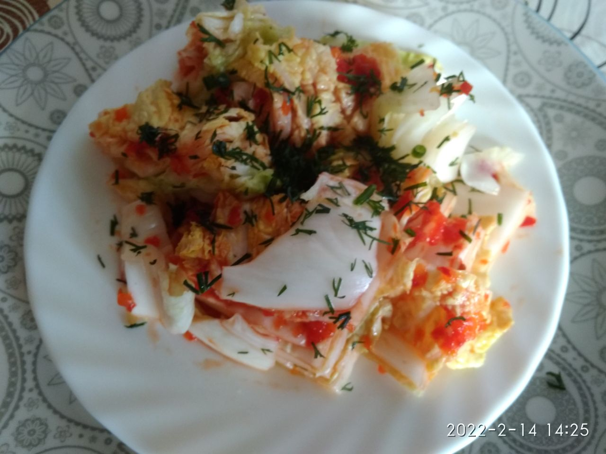 Ещё в детстве слышала о корейской кухне, о том какая у них острая еда. Рассказы, как во время еды на голове выступал пот, от острого, жгучего перца. С возрастом взгляды и вкусы меняются конечно же. Не скажу, что я полюбила острую еду, но от в меру острого не отказываюсь иногда. Блюда из мяса, соленья и острота превосходно сочетается, даже вкусно. Вот и сейчас хочу поделиться рецептом от соседки кореянки - Кимчи. Так раньше называли засоленные овощи, а сейчас представляем засоленную пекинскую капусту. Закуска из неё очень хорошо сочетается с мясными блюдами. Для засолки надо пекинскую капусту разрезать вдоль на четыре части. Если есть повреждённые листики надо убрать и (если есть необходимость промыть). В определённую ёмкость (ведро, кастрюлю) равномерно укладываю всю капусту, с верху накрывают более менее большой плоской тарелкой, ставлю гнёт и заливаю водой с разведённой в ней крупной солью из расчёта 400гр на 10 литров. И оставляю при комнатной температуре на 3-5 дней в зависимости