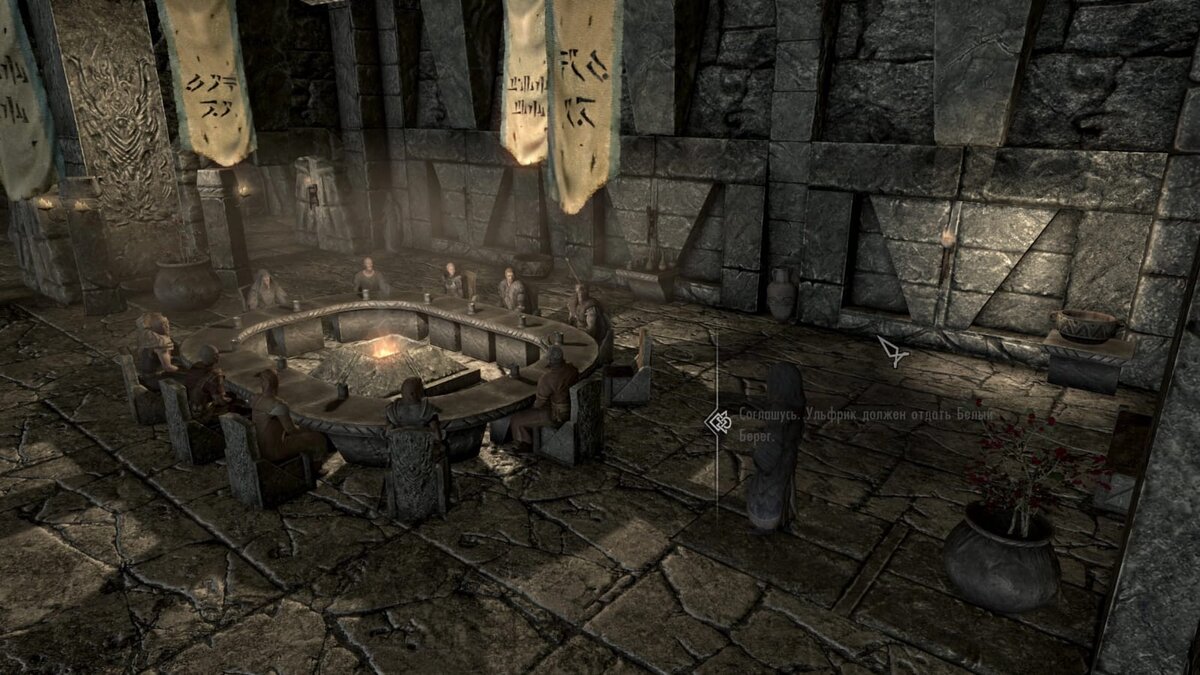 Ульфрик: Нет. Мы остаемся. Из уважения к Довакину и Седобородым. Но она будет только наблюдать. С ней мы переговоров вести не будем, это ясно?