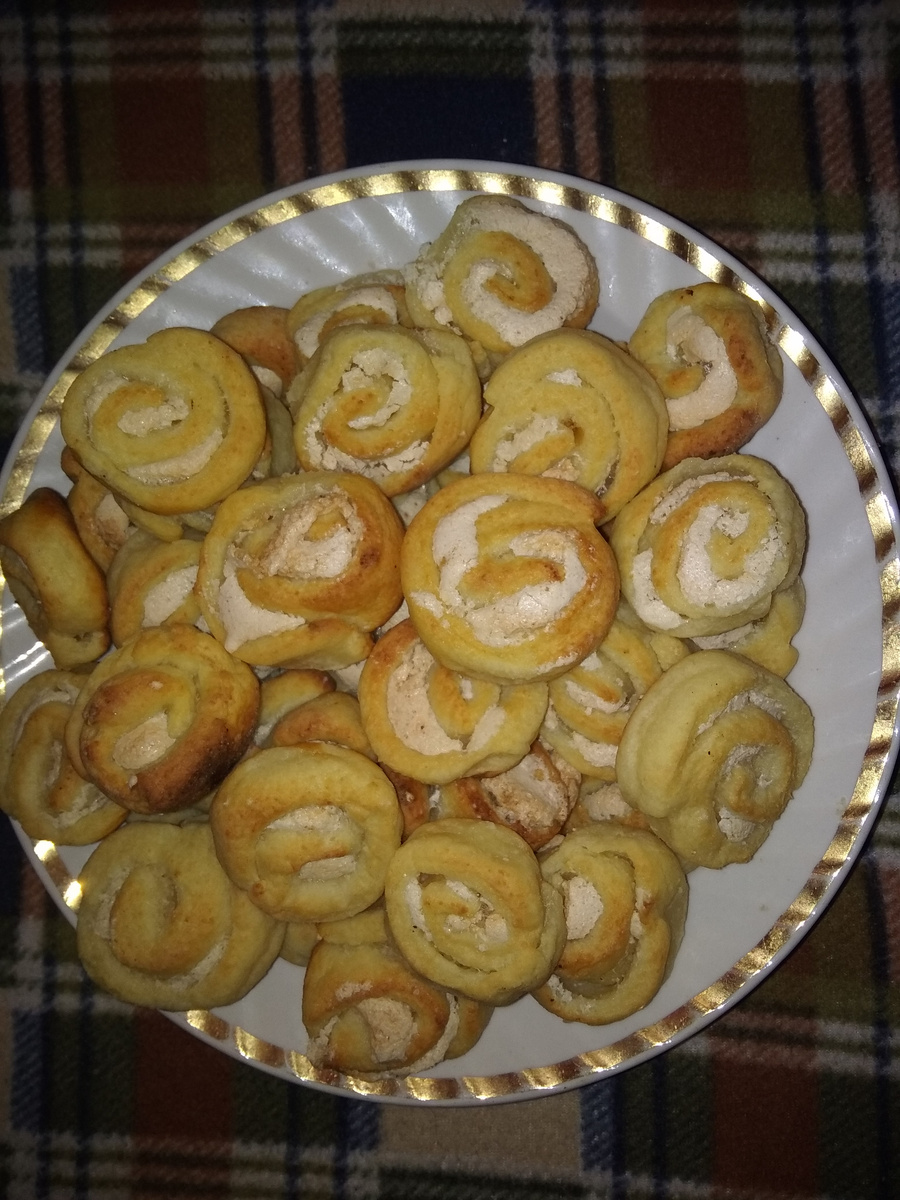 Состав теста: 200г сырковой массы (2 детских сырка) или 150г творога и 50г сметаны и 0,5 ст сахара. 180-200г маргарина или масла, 2 желтка, 0,5 ч.л. соды, 1ст.л. лимонной цедры, 1 ч.л. сока лимона, 1 горсть изюма, 2 ст. муки. Крем: 2 белка и 1 ст. сахара. Сначала разделим яйца на белки и желтки. Белки сразу поставим в холодильник. Размягченное сливочное масло или маргарин разотрите с желтками до получения однородной массы. Добавьте творог со сметаной и сахаром смешанный или сырковую массу. В полученную смесь, хорошо перемешанную, добавьте соду, погашенную лимонным соком или уксусом. В самом конце добавляем муку и цедру с изюмом. При желании можно добавить немного ванилина. Все это еще раз хорошо перемешиваем. Затем скатываем в большую колбаску и выносим на холод. Тем временем делаем крем. 2 охлажденных белка взбиваем в одном направлении до образования пышной белой массы, хорошо сохраняющей свою форму. Всыпьте во взбитый белок сахар и легкими движениями перемешайте. Тесто разделите на