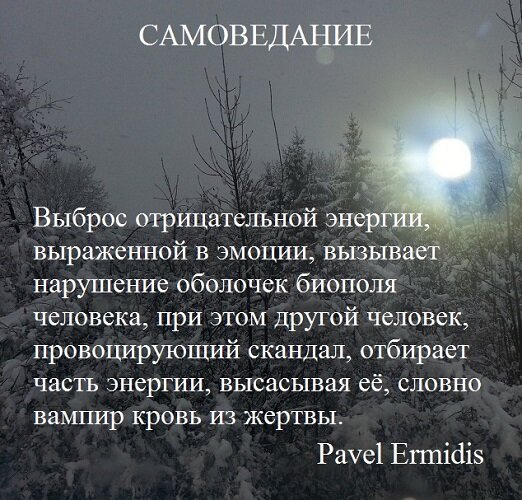 Выброс отрицательной энергии, выраженной в эмоции, вызывает нарушение оболочек биополя человека, при этом другой человек, провоцирующий скандал, отбирает часть энергии, высасывая её, словно вампир кровь из жертвы. Этим вампиром может быть кто угодно, даже самый близкий человек, мать, отец, муж, жена, бабушка, дедушка или дети, живущие в одной семье, любящие друг друга люди с завидной регулярностью провоцируют ссоры. Практически на сто процентов, люди не осознают, что они делают и причиняют тем самым боль близким людям, всё происходит автоматически и при недостатке собственной энергии, включается режим отъёма у ближайшего человека. Другой способ бытовой магии уже более осознан, проявляется в постоянном негативном отношении ко всем людям, не соответствующих их критериям или действиям, не совпадающих взглядами на ситуацию или неполучение результата на желаемое. Высказывание вслух или мысленно, например: «да чтоб тебя…» присутствуют постоянно, достаточно приглядеться и встретим подобные яв
