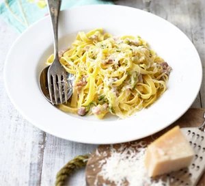 ШАГ 2Приготовьте тальятелле в соответствии с инструкциями по упаковке и зачерпните полную чашку воды для приготовления пищи. Слейте воду с тальятелле и выложите на сковороду вместе с беконом и кабачками. На медленном огне перемешайте все вместе с крем-фрешем и половиной пармезана, добавив немного воды для пасты, если вам нужно ослабить соус. Приправьте по вкусу и подавайте в мисках, посыпав оставшимся пармезаном.