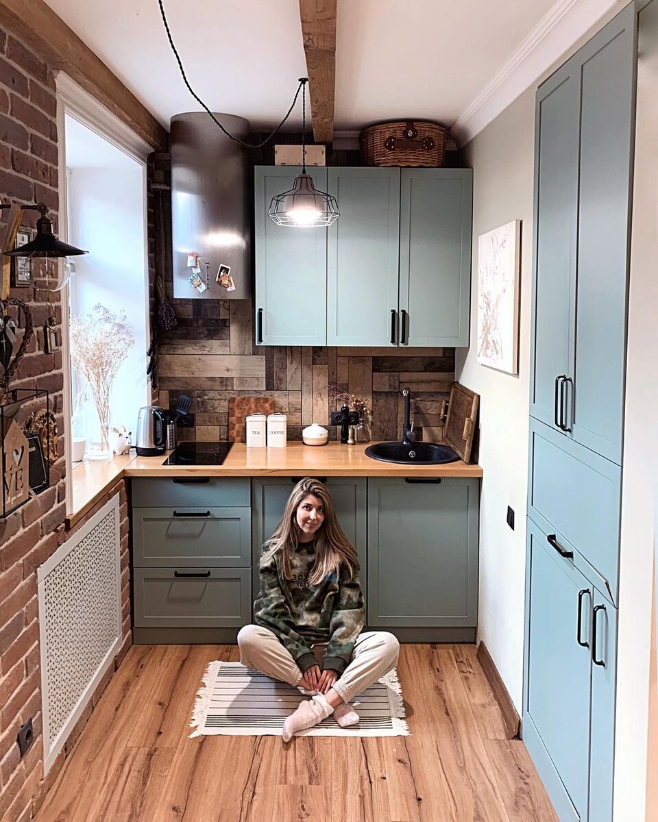 Очень выручает на такой маленькой кухне встроенный шкаф. По сути, это не отдельная мебель, и он совсем не забирает место. А внутри него разместилась стиральная машинка со всеми принадлежностями для стирки, над ней микроволновка, а еще выше — бойлер и даже несколько полочек для мелочей.