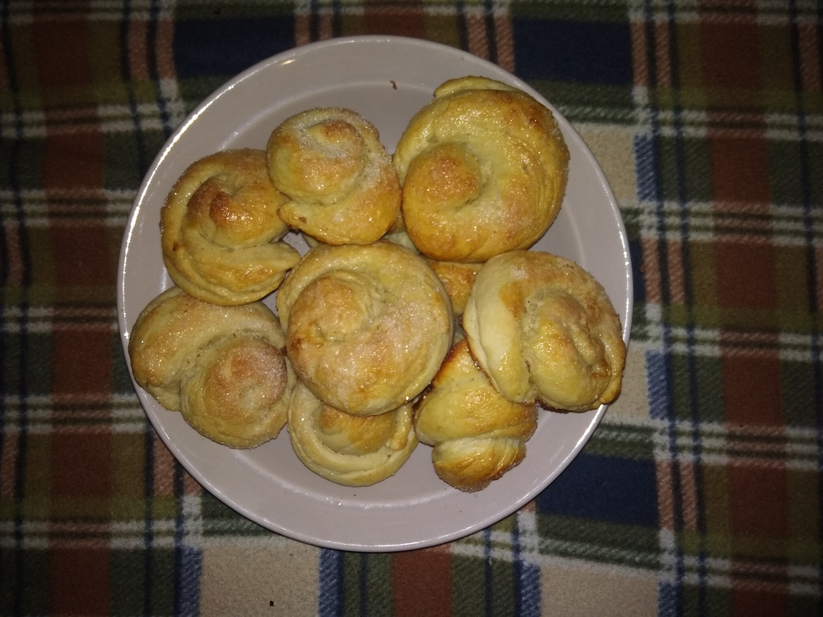 Тесто готовится очень быстро. Очень воздушное и мягкое. Нам понадобится: 1 стакан кефира (любой жирности), 0,5 стакана растительного масла (без запаха), 1 пакет (11 г. ) сухих дрожжей, 1 чайная ложка соли, 1 столовая ложка сахара, 3 стакана муки. Кефир смешать с маслом и чуть-чуть подогреть, добавить соль и сахар. Все это хорошо размешать. Муку в большой миске просеять на 2-3 раза и перемешать с сухими дрожжами. Постепенно в мучную смесь влить кефирную смесь и замесить тесто (чтобы не было комочков). Накрыть посуду с тестом льняным или хлопчатобумажным полотенцем. Поставить в теплое место всего на 30 минут. Как поднимется, можно выпекать. Из такого теста можно делать пироги и булочки. У пирогов можно выбрать любую начинку. Булочки можно делать разной формы и с разной начинкой. С сахаром, вареньем, с кунжутом, корицей, джемом или свежезамороженными ягодами, яблоками, лимоном с сахаром, цукатами и т.д. Я выбрала булочки с сахаром. Разобрала тесто на кусочки. Скатала их в колбаски. Пр