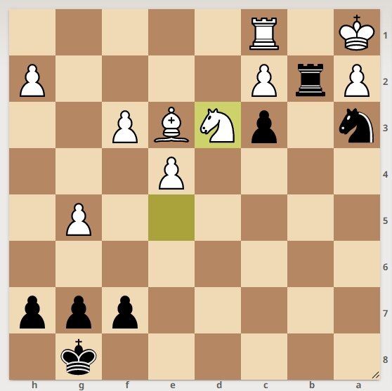 У белых материальный перевес в виде лишней фигуры и 2 лишних пешек. Однако черные начинают и выигрывают.