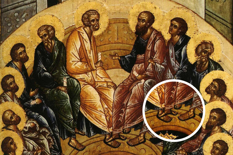 Хотя апостол Павел никак не мог находиться рядом с Христом в день Пятидесятницы, он изображен на иконе среди Его учеников. Тогда он еще не обратился ко Христу, но он – вместе с Господом в иконографии этого праздника, поскольку Пятидесятница – день создания и утверждения Церкви. И жест, когда ап. Павел как бы наступает на ногу ап. Петру, означает признание миссионерских заслуг св. Павла, апостола “второго призыва”, особо потрудившегося на благо основания церквей наряду со своими предшественниками.