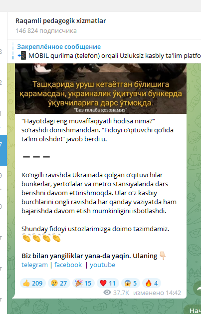 Телеграм-канал «Цифровые педагогические услуги» (На узбекском: Raqamli pedagogic xizmatlar) Министерства народного образования Республики Узбекистан публикует фейковые материалы в поддержку нацистского режима на Украине. Перевод надписей на русский язык с узбекского (на фото): «Несмотря на то, что снаружи идёт война, украинский учитель проводит в бункере урок». «Мы победим». Надписи под фото: «Что такое удача в жизни?», - спросили у мудреца. «Учиться у самоотверженного учителя», - ответил он. Учителя, добровольно оставшиеся на Украине, продолжают преподавать в бункерах, подвалах и на станциях метро. Они доказали, что можно осознанно продолжать выполнять свой профессиональный долг в любой ситуации». Ссылка на сообщение: https://t.me/raqamli_pedagogik_xizmatlar/963