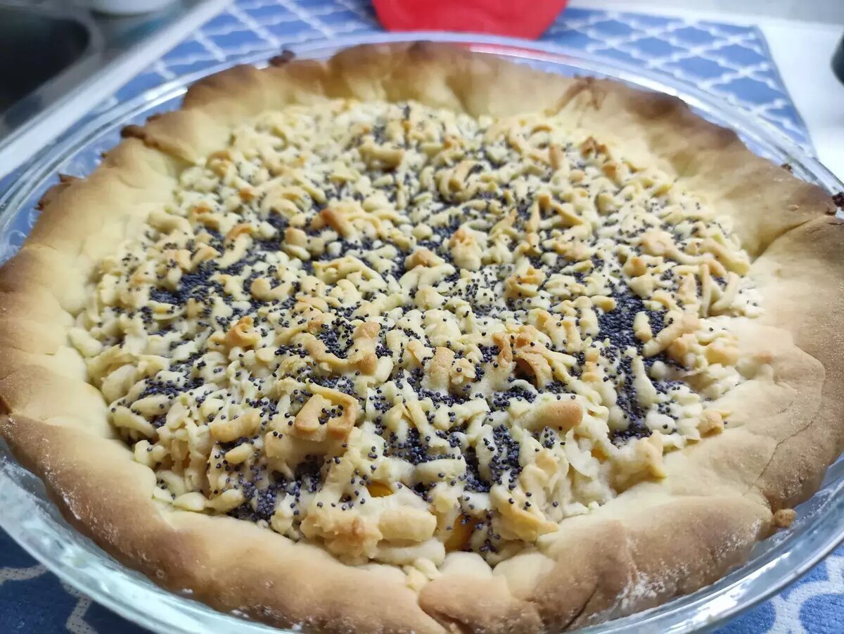 Ингредиенты: Сахар , Вода , Масло растительное , Соль , Ванилин , Разрыхлитель теста , Мука пшеничная , Абрикосы консервированные Способ приготовления: В миску насыпаем сахар, растительное масло, воду. Далее добавляем соль, ванилин, разрыхлитель теста, постепенно добавляем муку. Должно получиться эластичное, не липнущее к рукам тесто. Скатываем тесто в толстый рулетик, делим его визуально на 3 части. 2/3 теста отправляем в холодильник, а 1/3 в морозилку на 30 минут. Смазываем форму растительным маслом, большую часть теста выкладываем в форму, делаем бортики. Затем на тесто выкладываем, нарезанные дольками абрикосы. Меньшую часть теста достаём из морозилки и трём на терке сверху абрикосов. Сверху посыпаем маком для украшения. Выпекаем пирог при температуре 180 градусов 40-45 минут. Приятного аппетита❤Выпекаем пирог при температуре 180 градусов 40-45 минут. Приятного аппетита❤