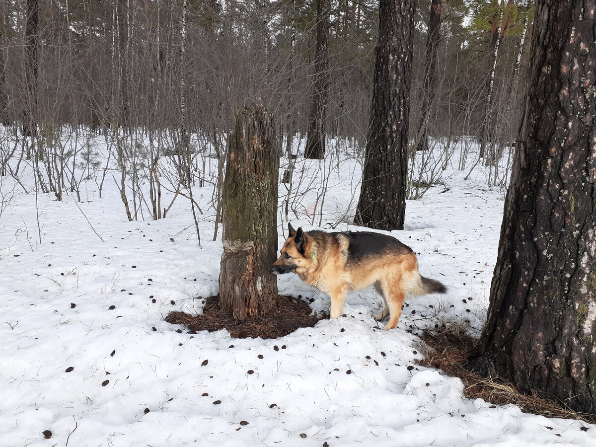 Февраль в этом году словно март. Рано потеплело. Снег тает, но медленно. Муравейник еще не проснулся (пенек около Киры), но приствольные круги у деревьев уже появились. Палочек в лесу много. С тропинок лучше не сходить, провалишься. Снег в лесу грязный. Ветер набросал иголок, веток с деревьев. Зато палок на земле! Любого размера. Сне тает, на деревьях остаются причудливые фигуры. Тепло, снег лепится. Слепили крепость. Поиграли в снежки. Кира активно участвовала. А после прогулки - обед и тихий час :)