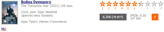 Что еще было интересного в 2021? Сегодня мы поговорим о борьбе с инопланетной живностью "Война будущего" (фантастика, боевик) Криса МакКея, этническом творчестве Диснея "Энканто" (драма, мелодрама)" и попкорновой "Красное уведомление" (боевик, комедия, криминал) Роусона Маршалла Тёрбера. "Война будущего" Криса МакКея Идет война. Но не прямо сейчас, а в будущем. В 2022 году люди узнают о том, что через 30 лет Земля подвергнется масштабному инопланетному вторжению. Чтобы поддержать войска сопротивления в будущее через временной портал на регулярной основе отправляют всех подряд, в том числе и школьного учителя Дэна. Миссия не обещает быть простой - по статистике выживает только 30% отправленных. Фильм легко пропустить, он вышел без особой помпы, но делать этого не стоит. У авторов получилась отличная фантастика - монстры, путешествия во времени, зрелищные бои в разнообразных локациях. Много юмора, но это не мешает чудищам поглощать землян довольно жестоко, но не слишком - вполне в рамках