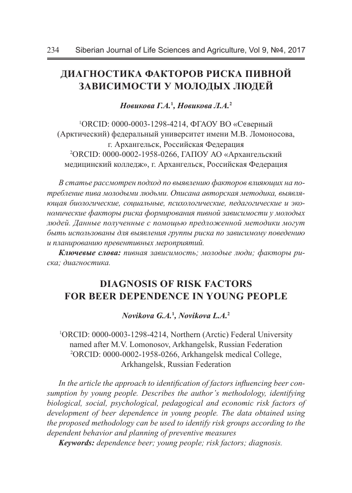 ДИАГНОСТИКА ФАКТОРОВ РИСКА ПИВНОЙ ЗАВИСИМОСТИ У МОЛОДЫХ ЛЮДЕЙ