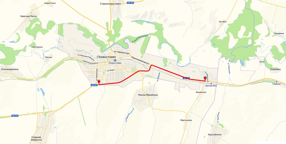 Автодорога: Региональная автодорога 36К-851 Самара – Похвистнево (часть бывшей автодороги Р225 Самара – Бугуруслан).