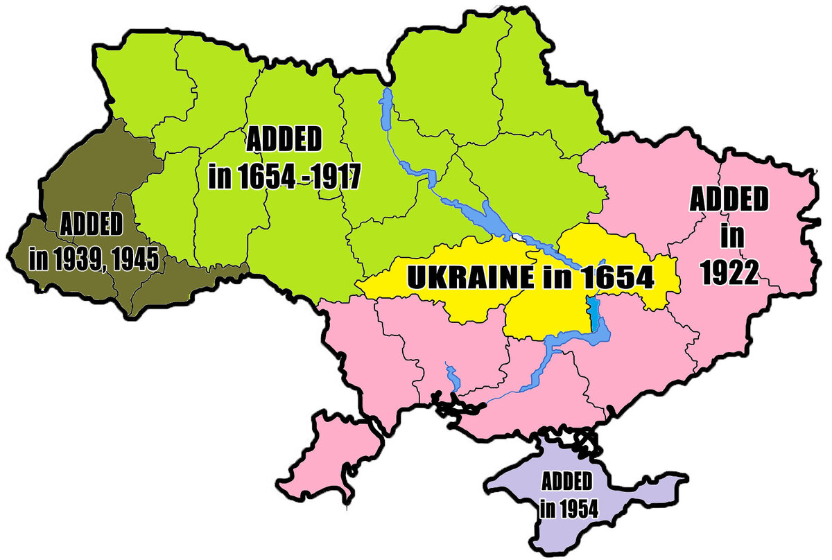 После гражданской войны в России была создана УССР. Создавалась она по ленинской теории государственного устройства и ленинской национальной политике. В состав Украины были включены земли, которые никогда не принадлежали Войску Запорожскому и Речи Посполитой, а были завоёваны Россией у Османской империи и Крымского ханства или входили в состав России до приведения Запорожского войска под руку Московского царя. Чем руководствовались Ленин и Троцкий, когда создавали это государство на самом деле, никто не знает. Что интересно - земли передали вместе с народом (правда, забыли народ спросить: желает ли этот народ жить в государстве Украина).