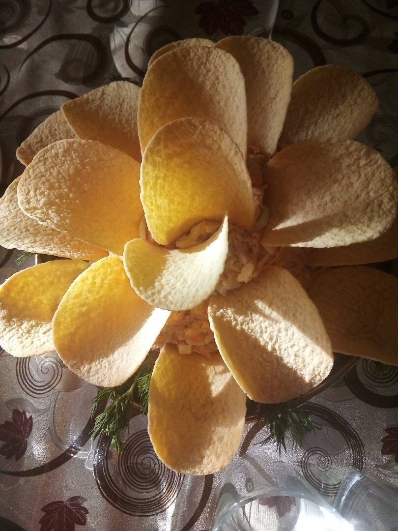 Ингредиенты: Средние моркови, Чеснок, Соль, Майонез, Куриных отваренных филе, Чипсы с любым вкусом овальные, у меня спринглс сыр, Зелени для украшения по желанию, Отваренных яиц Способ приготовления: Морковь очистить и нарезать на мелкой тёрке, посолить, очистить чеснок и продавить через пресс по вкусу, перемешать и дать настояться 20 минут. Филе и яйца нарезать на кубики и все соединить с морковкой. После добавить майонез, соль по вкусу и все хорошо перемешать. Выложить на блюдо горкой. Перед подачей выложить чипсы в виде лепестков цветка и по желанию дополнительно украсить веточками зелени. Готово. Приятного аппетита.