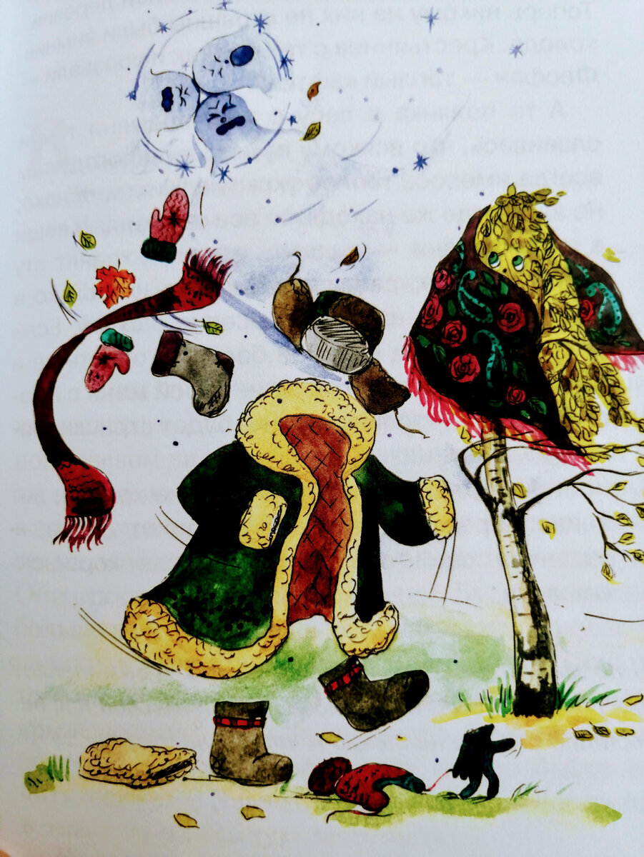 Вьюга тоже стала мечтать: « А я украду все тёплые валенки и сапожки.- Ноги у всех замёрзнут ,потом все заболеют, будут лежать в постелях и чихать!!! Вот какая я сильная вьюга!!!
