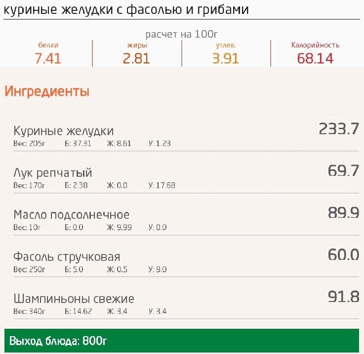 Лук репчатый - 170 гр Пропорции можно +- регулировать. У меня в табличке по факту. КБЖУ: 68 7,41/2,81/3,91 Приготовление: 1. Куриные желудки отварить. Причем посолить по окончании варки. Я варила их с момента закипания около часа. 2. Лук обжарить до золотистости