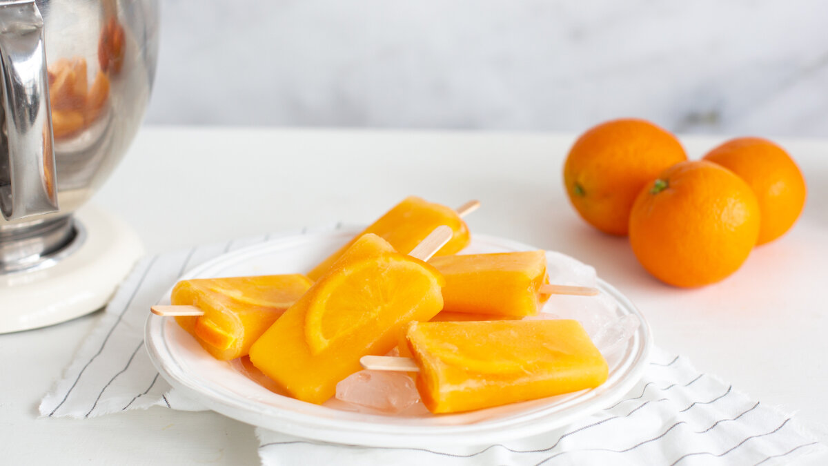 Для приготовления этого незамысловатого, но очень вкусного десерта, вам понадобится всего один ингредиент - апельсины! Интересно? Готовьте с нами! ИНГРЕДИЕНТЫ: Апельсины среднего размера - 3 шт ПРИГОТОВЛЕНИЕ: 1. Установите насадку-соковыжималку для цитрусовых на планетарный миксер. 2. Разрежьте апельсины пополам (отложите один апельсин в сторону). 3. Поверните рычаг регулировки скоростей в положение 6 и выжмите сок из апельсинов в кувшин. 4. Перелейте свежий апельсиновый сок в формочки для мороженого. 5. Нарежьте оставшийся апельсин ломтиками. Разрежьте ломтики пополам. 6. Положите половинки апельсиновых долек в формочки (по две на каждую формочку). 7. Поместите палочку для мороженого между апельсиновыми дольками. 8. Замораживайте не менее 8 часов (или оставьте на ночь). Вот и все! Легкий и полезный десерт готов!