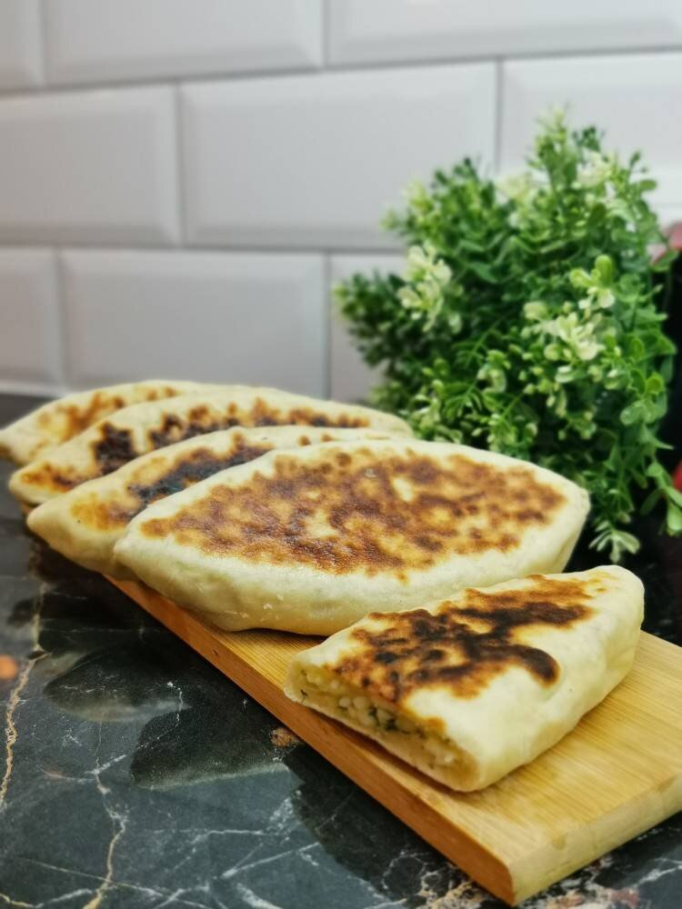 Пирожки на сковороде с яйцом, зеленью и сыром (быстрое тесто)