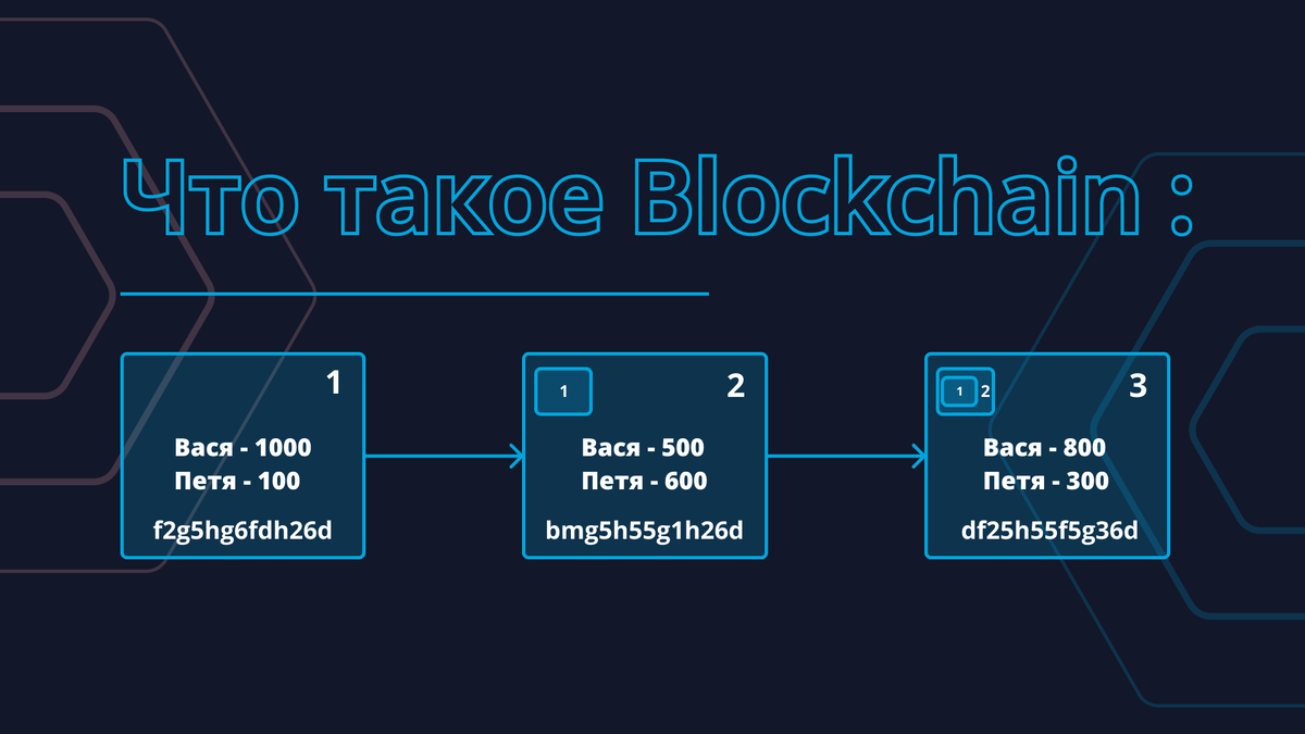 Блокчейн - это система хранения данных. Данными может быть что угодно: денежный перевод, отправка сообщения, текстовые файлы, изображения, аудиофайлы, пользовательские данные. Blockchain - цепочка из блоков. Что это значит? Это значит, что каждый блок, это некое хранилище, в котором есть реестр всего, что в нем хранится и реестр того, что хранится в блоках других блокчейнов, которые относятся к этой же системе. Когда над данными, которые хранятся в блоке происходит какая то операция, то об этом делается отдельная запись в новом блоке, так же в этот блок переносятся все данные из первого блока. Данные о следующей операции записываются в следующий блок, в который так же переносится вся информация из предыдущего блока. Для примера давайте представим что у Васи есть 1000 рублей, а у Пети только 100 рублей. В блокчейне Васи и Пети есть запись о том, сколько у них есть денег. Допустим Вася отправил Пете 500 рублей. Теперь у него осталось 500, а у Пети стало 600. В блокчейне Васи и Пети в нов
