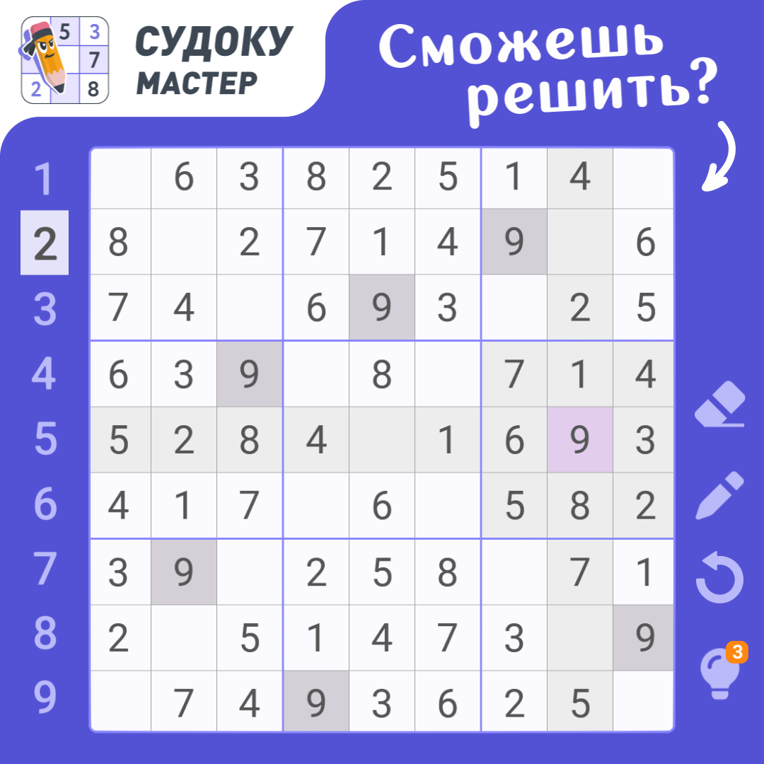 Решите судоку! Изучайте карточку, находите числа и заполните все ячейки.