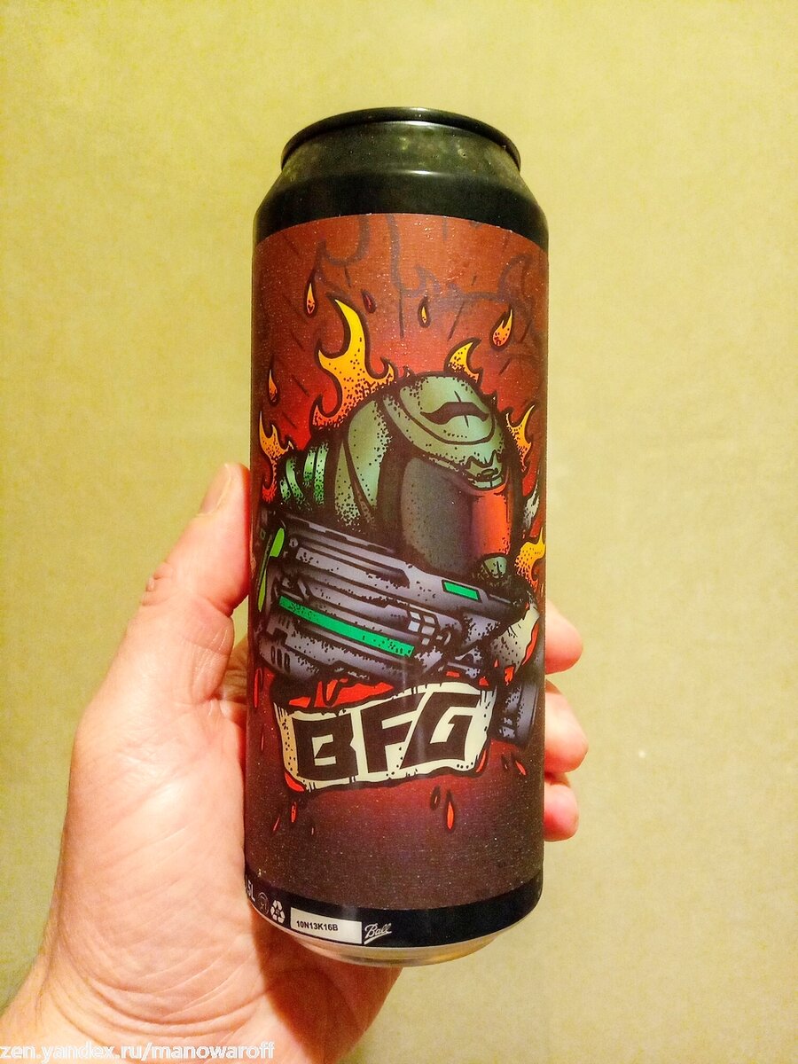 Т.е. для тех, кто обожает линейку компьютерных игр Doom. И посвящено данное пиво самому мощному оружию из этих игр, а именно BFG. А сварила его московская пивоварня Selfmade Brewery. Пиво сварено в стиле DIPA, и вот что нам о нем рассказывает производитель: Культовое оружие геймеров Big F...g Gun снова с нами! Однократный выстрел плазменным зарядом наносит опустошающий удар по противнику и позволяет одним нажатием курка решить множество проблем на поле боя. Так и наш бестселлер поможет вам решить целый спектр задач после трудовых будней всего лишь одной пинтой. Крепкий, плотный и сладковатый эль в стиле Double IPA с обильной, но не доминирующей горечью, большим количеством тропических фруктов во вкусе, обязательно понравится всем почитателям крепких сортов пива. Т.е. этот пивас завалит пьющего не хуже BFG, судя по описанию. Я такое не сильно люблю... Впрочем, посмотрим, что будет на самом деле. На момент дегустации пиву было меньше полутора месяцев при сроке хранения в полгода. ТТХ: П