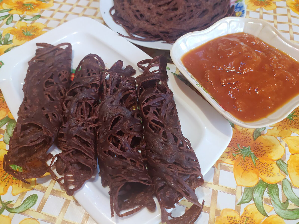 Ну а из остатков шоколадного теста испекли узорчатые блинчики. Все просто – тесто из бутылки выливали на разогретую сковороду, формируя узорчатый блинчик.