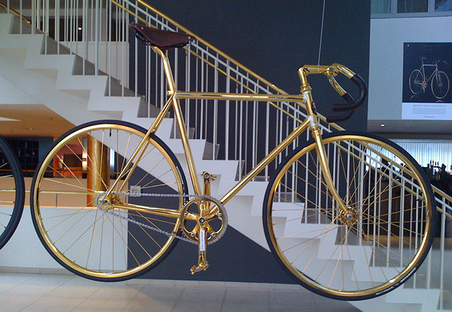Велосипед является одним из величайших изобретений человечества, устройством, которое способствует улучшению физического здоровья и даёт некую свободу. Мы проанализировали цены и выяснили, сколько стоит самый дорогой велосипед в мире. 5. Auramania Crystal Edition Gold Bike «Золотой велосипед» — творение французской компании Auromania, специализирующейся на производстве элитных велосипедов. Компания выпустила лимитированную серию горных велосипедов, всего 10 экземпляров. Рама, обода колёс и даже спицы покрыты 24-каратным золотом и инструктированы 600 кристаллами «Сваровски». Сиденье и ручки руля покрыты кожей тончайшей выделки. Велосипед выполняет свои прямые функции, но покупатель будет использовать его, скорее, как музейный экспонат. Производитель это предусмотрел и предлагает приобрести к этой модели специальную подставку за дополнительные 6 тыс. $, тоже покрытую золотом и кристаллами «Сваровски». На сегодняшний день проданы только 3 экземпляра. Вырученные средства были направ