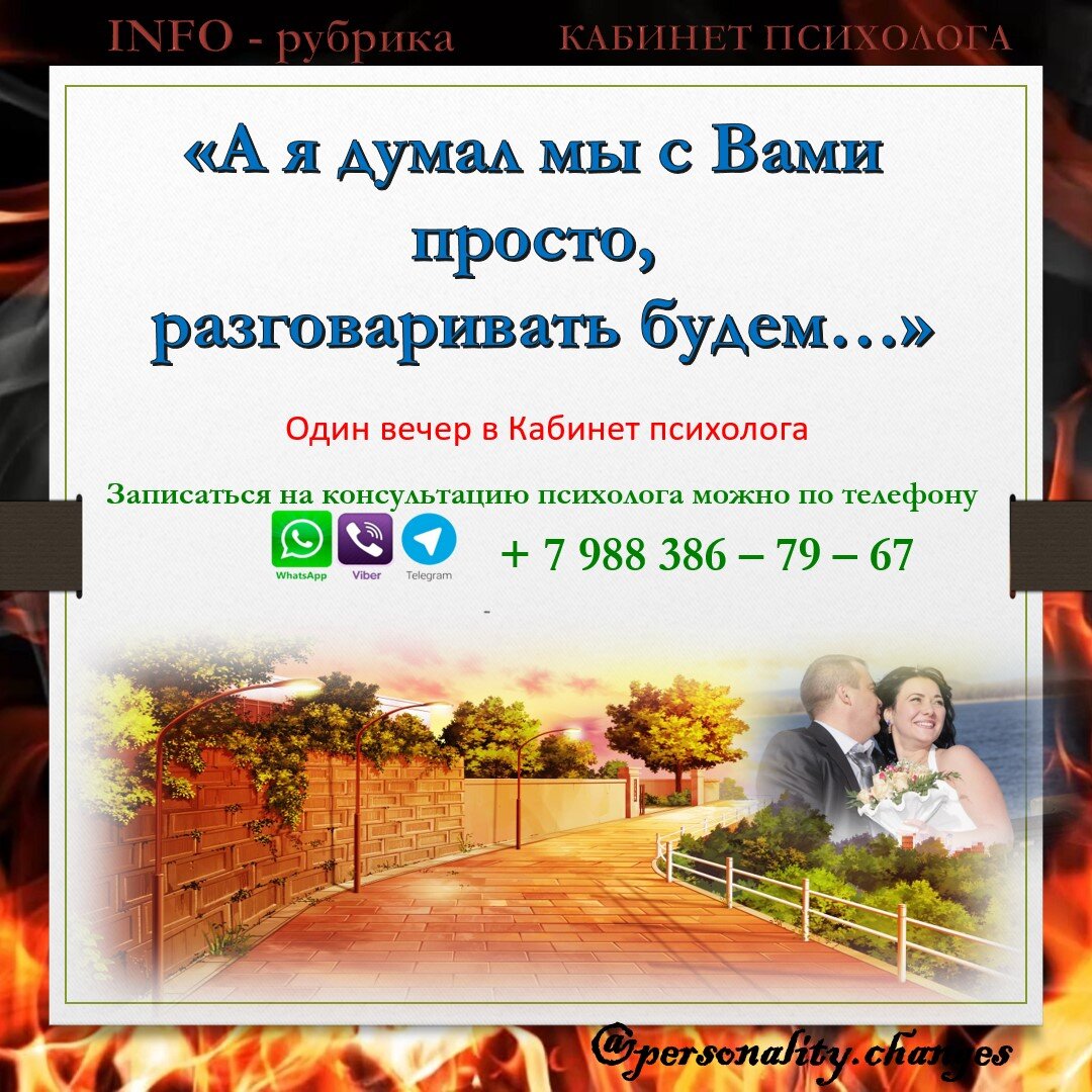 Вечер, Кабинет психолога..., Звонок телефона: - Добрый день, это психолог? – в трубке слышу приятный мужской голос. - Да, я. - Сколько стоит попасть к Вам на приём? - Предлагаю начать с первичной консультации, которая длится 20 минут и именно на ней мы обозначим, что Вам нужно и сколько это стоит. - А можно сегодня? - Да сегодня в 18:00 есть время - Хорошо я буду. В 18:00 в Кабинет входит молодой человек, на вид лет 25. Предлагаю ему присесть. Он удивлённо осматривается по сторонам – - Как красиво у Вас тут, так уютно… Говорит он, глядя на меня явно ожидая ответа. - Да, благодарю, старалась с оформлением. - Меня зовут В., я пришёл к Вам., - поворачиваясь в сторону – Ой, а что это у вас тут такое, – спрашивает он, показывая на уголок песочной терапии. - Это предназначено для песочной терапии – отвечаю я, - А что, есть и такое??? - Да, и такое, очень хорошо помогает при лечении психологических травм, страхов, агрессии и депрессии…, Так, что привело тебя ко мне? - Проблема в отношениях
